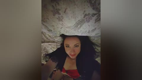 Video of a fair-skinned, curvy woman with long brown hair, wearing red lingerie, lying on a bed in a dimly lit room with blurred background.