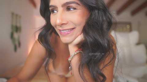 Video of a topless woman with medium skin tone, straight black hair, and large breasts, in a cozy living room with wooden beams and modern decor.