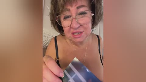 A video of a woman in white lingerie, with pale skin and shoulder-length brown hair, seated indoors, wearing a pink face mask.