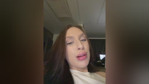 A video of a young woman with long, straight brown hair, fair skin, and a petite frame, wearing a white spaghetti-strap top. She is indoors, in a dimly lit room with dark wooden furniture and a white ceiling.