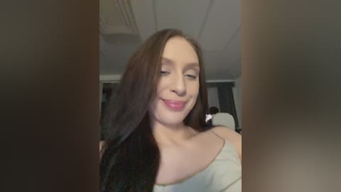 Video of a young Caucasian woman with long, straight brown hair and fair skin, wearing a white spaghetti-strap tank top, smiling subtly in a dimly lit, modern room with dark curtains and a white ceiling fan.