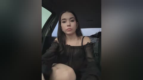Video of a young woman with light skin and straight, dark hair, wearing a sheer black top, sitting in a car with blurred scenery visible through the windows.